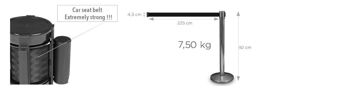 High-quality barrier posts with automatic retractable belt system. The post weight was raised to 7.5 kg, and the belt extended to 225 cm. With that large weight the post remains stable, even with such a long belt. The retracting head is integrated with the post, and its replacement is very simple and quick. The belt used in this system is a vehicle safety belt. This is an exceptionally strong and durable material that will never fray. delivery includes a belt in red colour.