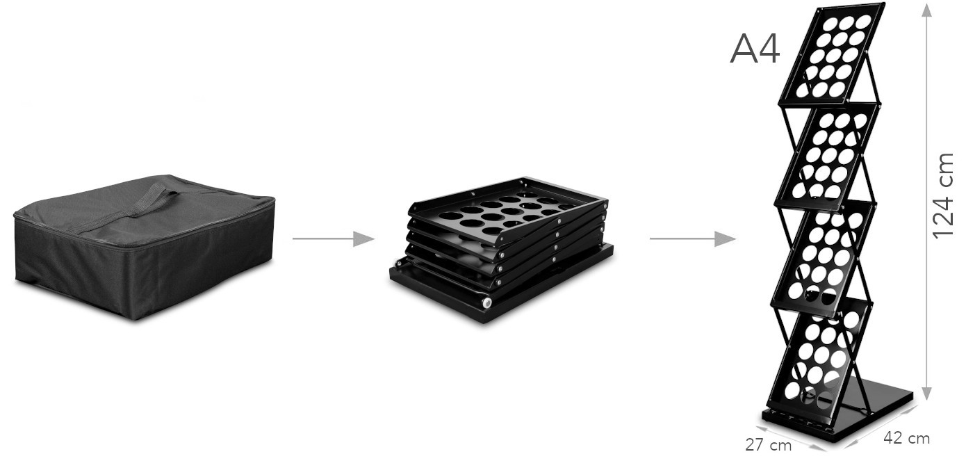 Boston brochure holder is a definite best-seller in our product range. Small dimensions, lightweight frame and a very attractive price all make it a desirable product. Boston is made entirely of metal and powder coated black. This stand is intended for catalogs/brochures in A4 format.