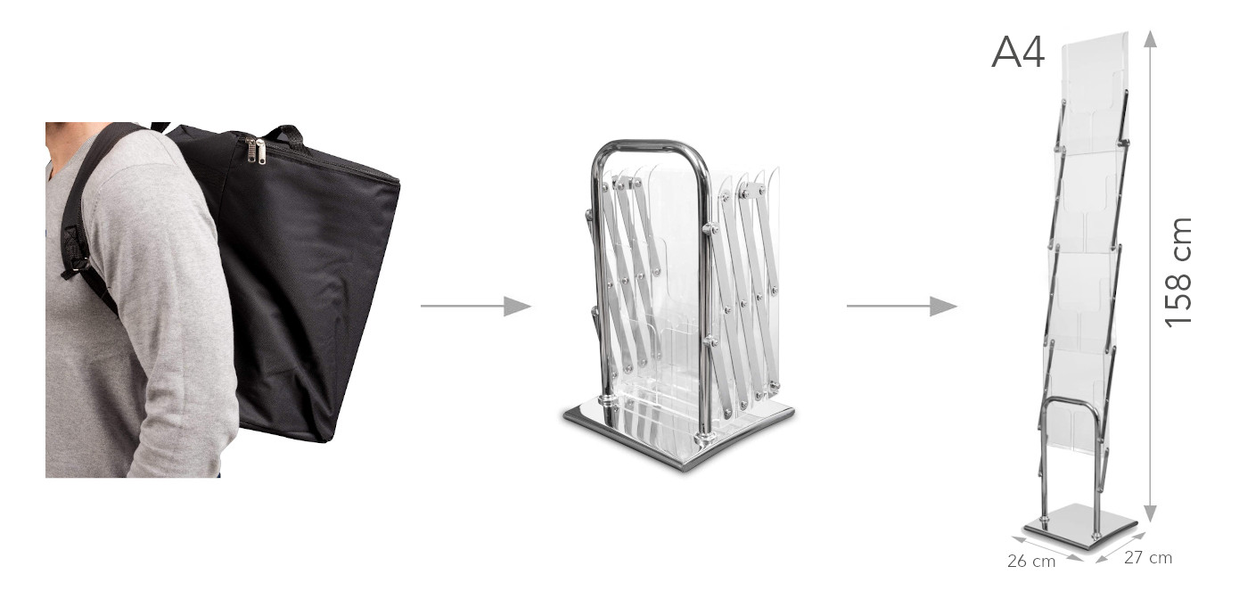 Columbia is an extraordinarily stylish stand, with pockets made of thick transparent plexiglass board. Its extraordinary nature is underlined by chrome plated base and a stylish grip making it easy to handle. This product is additionally equipped with a handy backpack used to transport this stand. The stand is intended for catalogs/brochures in A4 format.