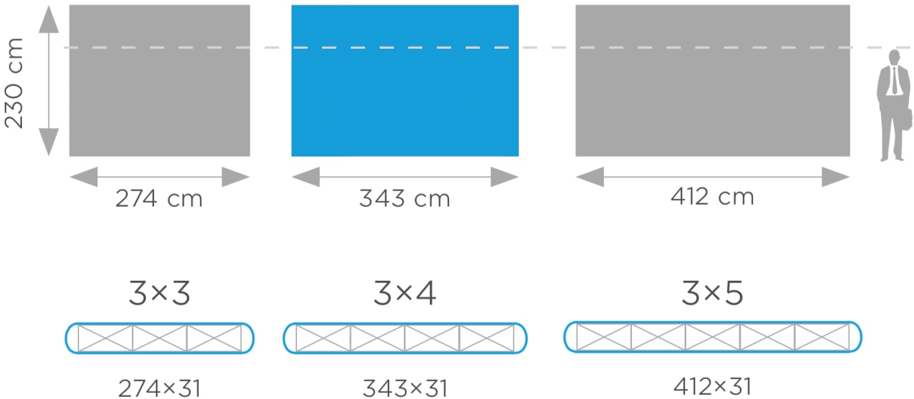 This set includes: foldable pop up frame, mounting top bars with adhesive 3M tape, full set of construction bars, 3M magnetic tape, full set of front and side PVC panels. To protect the panels from any transport damage, we recommend to buy a trolley case or a case counter.
